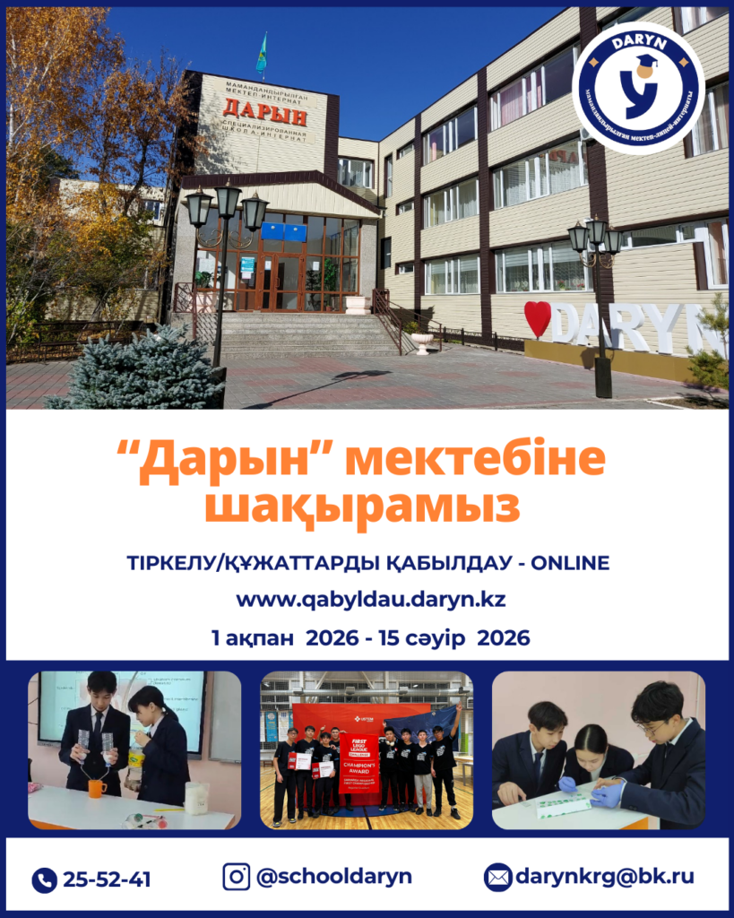 «Дарын»мамандандырылған мектеп-лицей-интернатына 2026-2027 оқу жылының 5-сыныбына конкурсқа өтініштерді қабылдау ағымдағы жылдың 1 ақпан-15 сәуір аралығында жүзеге асырылады.